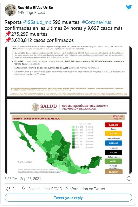 La Secretaría de Salud reportó este sábado 596 nuevas muertes por COVID-19 para un total de 275 mil 299 defunciones, además de otros nueve mil 697 nuevos casos para llegar hasta los tres millones 628 mil 812 contagios.Con estas cifras, México se mantiene como el cuarto país con más muertes por COVID-19 por detrás de Estados Unidos, Brasil y la India, y el decimoquinto en número de contagios confirmados, según el recuento de la Universidad Johns Hopkins.Asimismo, calculan que hay 68 mil 502 casos activos, que han presentado síntomas durante los últimos 14 días y que suponen el 1.8 del total.Además, desde el inicio de la pandemia se han recuperado dos millones 978 mil 300 personas.La ocupación media de camas generales en los hospitales mexicanos es del 36 % y del 30 % para camas de terapia intensiva.Las autoridades también indicaron que el programa de vacunación, que contempla a todos los mayores de 18 años, acumula 98.9 millones de dosis aplicadas al sumar 612 mil 781 durante la última jornada.El reporte también precisó que 44.3 millones de personas han completado la pauta de vacunación, del total de 126 millones de habitantes que tiene el país, es decir el 35.2 % de la población.Si te interesó esta noticia y quieres saber más, entonces descarga y descubre INFORMAPlus, la aplicación digital de EL INFORMADOR, en donde tenemos contenidos exclusivos, seleccionados por nuestros editores, para darles una experiencia más completa a los lectores. Si eres suscriptor de EL INFORMADOR tu acceso está incluido, solicítalo al 33 3678-7777.Descarga la aplicación y pruébala GRATIS por treinta días.Para iOS: https://apple.co/35jaVgbPara Android: https://bit.ly/3gwVSEVJM