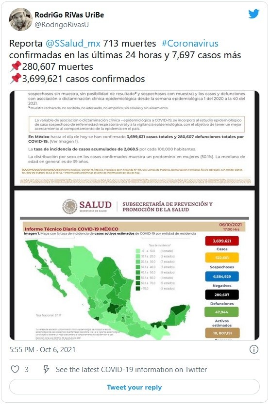 La Secretaría de Salud reportó este miércoles 713 nuevas muertes por COVID-19 para un total de 280 mil 607 defunciones, además de otros siete mil 697 nuevos casos para llegar hasta los tres millones 699 mil 621 contagios.Con estas cifras, México se mantiene como el cuarto país con más muertes por COVID-19 por detrás de Estados Unidos, Brasil y la India, y el decimoquinto en número de contagios confirmados, según el recuento de la Universidad Johns Hopkins.Calculan que en el país hay 47 mil 944 casos activos, que han presentado síntomas durante los últimos 14 días y que suponen el 1.2 % de los casos totales.Además, desde el inicio de la pandemia se han recuperado tres millones 057 mil 710 personas.La ocupación media de camas generales es del 31 % y del 27 % para camas de terapia intensiva.Las autoridades también indicaron que el programa de vacunación, que contempla a todos los mayores de 18 años, acumula 104.55 millones de dosis aplicadas al sumar 720 mil 886 durante la última jornada.Hasta ahora, 65.69 millones de personas mayores de 18 años tiene al menos una dosis. Es decir, el 73 % del total de la población adulta. De ese total, el 70 % —46.3 millones— ha recibido el esquema completo.JM