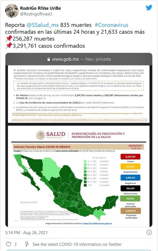 La Secretaría de Salud reportó este jueves 835 nuevas muertes por COVID-19 hasta alcanzar las 256 mil 287, además de 20 mil 633 nuevos casos para un total de tres millones 291 mil 761 contagios, en plena tercera ola que inició a finales de mayo.Apenas el miércoles, México reportó 986 muertes, el pico más alto de esta tercera ola.Con estos registros, el país se mantiene como el cuarto país con más muertes por COVID-19 por detrás de Estados Unidos, Brasil y la India, y el decimoquinto en número de contagios confirmados, según el recuento de la Universidad Johns Hopkins.Calculan que hay 132 mil 418 casos activos en el país, que han presentado síntomas durante los últimos 14 días y que suponen el 3.8 % del total.Desde el inicio de la pandemia se han recuperado dos millones 623 mil 625 personas.La ocupación media de camas generales es del 53 %, y del 46 % para camas de terapia intensiva.Las autoridades también indicaron que hasta ahora el programa de vacunación, que contempla a todos los mayores de 18 años, ha administrado 82.67 millones de dosis de la vacuna anticovid, al sumar 755 mil 015 en la última jornada.El reporte también precisó que 32.27 millones de personas han completado el esquema de vacunación, del total de 126 millones de habitantes que tiene el país.Si te interesó esta noticia y quieres saber más, entonces descarga y descubre INFORMAPlus, la aplicación digital de EL INFORMADOR, en donde tenemos contenidos exclusivos, seleccionados por nuestros editores, para darles una experiencia más completa a los lectores. Si eres suscriptor de EL INFORMADOR tu acceso está incluido, solicítalo al 33 3678-7777Descarga la aplicación y pruébala GRATIS por treinta días.Para iOS: https://apple.co/35jaVgbPara Android: https://bit.ly/3gwVSEVJM