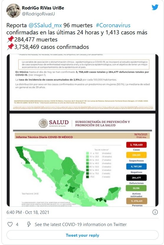 La Secretaría de Salud reportó este lunes 96 nuevas muertes por COVID-19 para un total de 284 mil 477 defunciones, además de otros 1.413 nuevos casos para llegar hasta los tres millones 758 mil 469.Con estas cifras, México se mantiene como el cuarto país con más muertes por coronavirus, detrás de Estados Unidos, Brasil y la India, y el decimoquinto en número de contagios confirmados, según el recuento de la Universidad Johns Hopkins.Las autoridades sanitarias reconocen que, con base en las actas de defunción, la pandemia rondaría los 410 mil fallecidos en el país y estiman que México acumula en realidad tres millones 976 mil 614 contagios.De la cifra oficial total, 32 mil 136 son los casos activos, que han presentado síntomas durante los últimos 14 días y suponen el 0.8 %; además, desde el inicio de la pandemia se han recuperado tres millones 122 mil 072 personas.La ocupación media de camas generales es del 25 % y del 21 % para camas de terapia intensiva.Las autoridades también indicaron que el programa de vacunación, que contempla a todos los mayores de 18 años, acumula más de 112.19 millones de dosis aplicadas al sumar 255 mil 361 durante la última jornada.Hasta ahora, 69.1 millones de personas mayores de 18 años tienen al menos una dosis. Es decir, el 77 % del total de la población adulta. De ese total, el 75 % (51.29 millones) ha recibido el esquema completo.JM