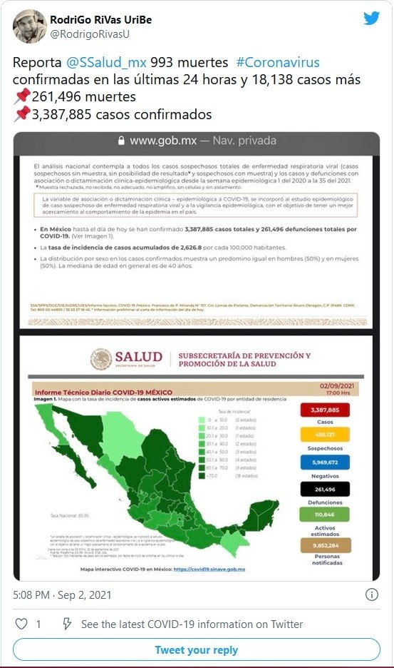 La Secretaría de Salud reportó este jueves 993 nuevas muertes por COVID-19 para un total de 261 mil 496 defunciones, además de otros 18 mil 138 nuevos casos para un total de tres millones 387 mil 885 contagios, en plena tercera ola de la pandemia.Con estas cifras, México se mantiene como el cuarto país con más muertes por COVID-19 por detrás de Estados Unidos, Brasil y la India, y el decimoquinto en número de contagios confirmados, según el recuento de la Universidad Johns Hopkins.Las autoridades sanitarias creen que, con base en las actas de defunción, la pandemia rondaría los 400 mil fallecidos en el país y estiman que México acumula en realidad tres millones 597 mil 450 casos de contagio.De esta cifra total, 110 mil 846 son los casos activos, que han presentado síntomas durante los últimos 14 días y que suponen el 3 % del total. Además, desde el inicio de la pandemia se han recuperado dos millones 727 mil 659 personas.La ocupación media de camas generales es del 49% y del 44 % para camas de terapia intensiva.Las autoridades también indicaron que hasta ahora el programa de vacunación, que contempla a todos los mayores de 18 años, ha administrado 85.84 millones de dosis de la vacuna anticovid.El reporte también precisó que 34.65 millones de personas han completado el esquema de vacunación, del total de 126 millones de habitantes que tiene el país.Si te interesó esta noticia y quieres saber más, entonces descarga y descubre INFORMAPlus, la aplicación digital de EL INFORMADOR, en donde tenemos contenidos exclusivos, seleccionados por nuestros editores, para darles una experiencia más completa a los lectores. Si eres suscriptor de EL INFORMADOR tu acceso está incluido, solicítalo al 33 3678-7777Descarga la aplicación y pruébala GRATIS por treinta días.Para iOS: https://apple.co/35jaVgbPara Android: https://bit.ly/3gwVSEVJM
