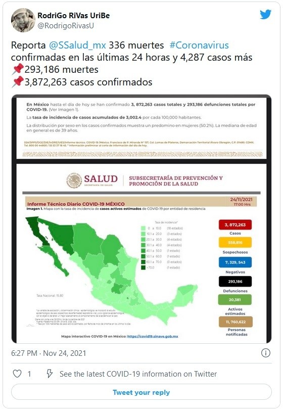 La Secretaría de Salud reportó este miércoles 336 nuevas muertes por COVID-19 para un total de 293 mil 186 defunciones confirmadas, además de otros cuatro mil 287 casos para llegar hasta los tres millones 872 mil 263 detectados.El país suma 17 semanas consecutivas de descenso en los contagios tras una tercera ola que alcanzó su pico entre julio y agosto.Las autoridades sanitarias reconocen que, con base en las actas de defunción, la pandemia rondaría los 440 mil fallecidos en el país y estiman que México acumula en realidad cuatro millones 094 mil 478 contagios.De esta cifra, 20 mil 381 son los casos activos, que han presentado síntomas durante los últimos 14 días y suponen el 0.5 % del total. Además, desde el inicio de la pandemia se han recuperado tres millones 232 mil 062 personas.La ocupación media de camas generales en los hospitales mexicanos se mantiene en 17 %, y el uso de camas de terapia intensiva en 13 por ciento.Las autoridades también indicaron que el programa de vacunación, que contempla a todos los mayores de 18 años, acumula más de 131.37 millones de dosis aplicadas, al sumar 187 mil 912 durante la última jornada.Hasta ahora, 76.04 millones de personas mayores de 18 años tienen al menos una dosis. Es decir, el 85 % del total de la población mayor de edad. De ese total, el 85 % (64.5 millones) ha recibido el esquema completo.JM