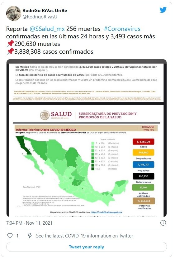 La Secretaría de Salud registró este jueves 256 nuevas muertes por COVID-19 para un total de 290 mil 630 defunciones confirmadas, además de otros tres mil 493 casos para llegar hasta los tres millones 838 mil 308 contagios detectados.Las autoridades sanitarias reconocen que, con base en las actas de defunción, la pandemia rondaría los 440 mil fallecidos en el país y estiman que el país acumula en realidad cuatro millones 059 mil 282 contagios.De la cifra oficial total, 22 mil 301 son los casos activos, que han presentado síntomas durante los últimos 14 días y suponen el 0.5 %. Además, desde el inicio de la pandemia se han recuperado tres millones 200 mil 268 personas.La ocupación media de camas generales es del 17 % y del 15 % para camas de terapia intensiva.Las autoridades también indicaron que el programa de vacunación, que contempla a todos los mayores de 18 años, acumula más de 129.2 millones de dosis aplicadas, al sumar 261 mil 575 durante la última jornada.Hasta ahora, 75.26 millones de personas mayores de 18 años tienen al menos una dosis. Es decir, el 84 % del total de la población adulta. De ese total, el 83 % (62.89 millones) ha recibido el esquema completo.JM