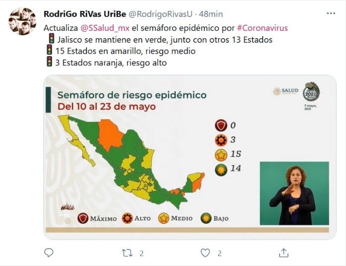 Autoridades de la Secretaría de Salud (Ssa) reportaron que el semáforo epidemiológico del país tendrá 14 estados en verde, 15 en amarillo, tres en naranja y ninguno en rojo durante el periodo del 10 al 23 de mayo, en tanto que se ha registrado una disminución en hospitalizaciones por COVID-19.De acuerdo con las cifras dadas en la conferencia vespertina de este viernes, el país registró 484 nuevas defunciones por coronavirus, por lo que en total en el país ya hay 218 mil 657 fallecimientos, mientras que se confirmaron tres mil 043 nuevos casos para llegar a un total de dos millones 361 mil 874 infecciones confirmadas.Lo anterior, en sincronía con lo dicho el jueves por el subsecretario de Prevención y Promoción de la Salud, Hugo López-Gatell, quien aseguró que, por el momento, México libró la tercera ola de COVID-19 tras las vacaciones de Semana Santa."Muy afortunadamente la tercera ola no se presentó, era nuestra obligación decir que podía existir ese riesgo para llamar a la población a tener mayor cautela, pero hubo éxito", concluyó.En tanto, durante con la actualización de esta tarde, el semáforo epidemiológico ubicó a Chihuahua, Tabasco y Quintana Roo en color naranja, mientras que la Ciudad de México y la Zona Metropolitana del Valle de México se ubican en color amarillo.JM