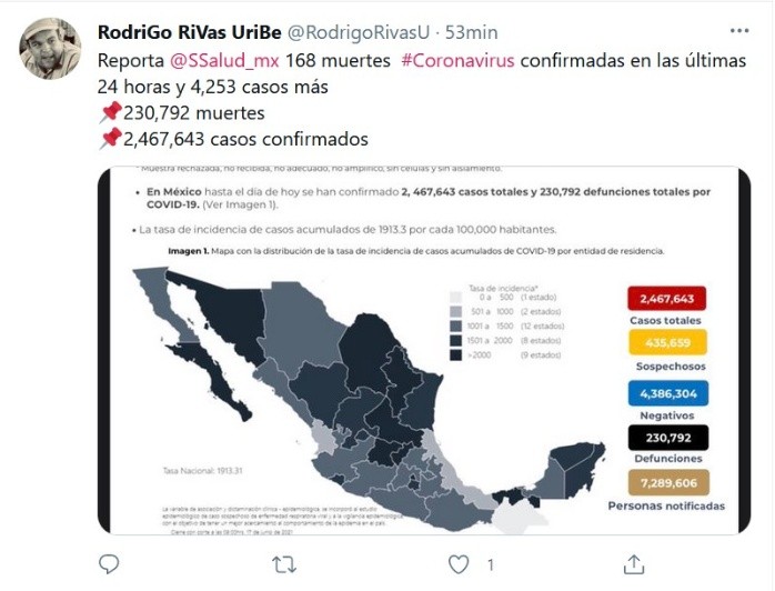 México reportó 147 nuevas muertes por COVID-19 en las últimas 24 horas, con lo que llegó a un total de 230 mil 792 decesos, informó este jueves la Secretaría de Salud en su reporte técnico de la enfermedad.Además, se informó de cuatro mil 253 contagios que elevan a dos millones 467 mil 643 los casos confirmados.Con estas cifras, México se ubica como el cuarto país del mundo con más decesos, por detrás de Estados Unidos, Brasil e India, y el decimoquinto en número de contagios confirmados, según el recuento de la Universidad Johns Hopkins.El reporte señaló que el número de casos activos estimados es de 26 mil 216; es decir, menos del 1 % del total de los contagiados estimados totales.Además, se reportó a un millón 964 mil 300 personas que se consideran recuperadas después de haber padecido la enfermedad.El informe también apuntó que la ocupación media de camas generales en los hospitales mexicanos es del 16 % y del 14 % para camas de terapia intensiva con respirador.El informe detalla que ya se han administrado 38.6 millones de dosis de la vacuna anticovid, 384 mil 900 dosis durante el miércoles.Además, indicó que un total de 15 millones 551 mil 250 personas han recibido las dosis necesarias para completar el esquema de vacunación.El programa de vacunación contempla por ahora a los adultos mayores de 60 años, adultos entre 50 y 59 años, entre 40 y 49 años, mujeres embarazadas, personal médico y personal educativo.JM