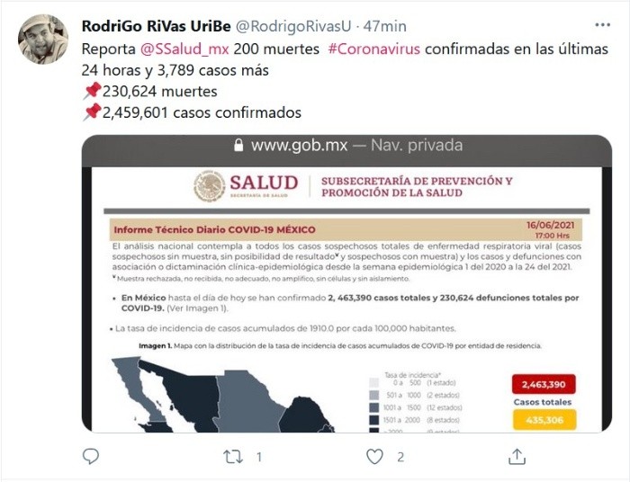 México reportó 200 nuevas muertes por COVID-19 en las últimas 24 horas, con lo que llegó a un total de 230 mil 624 decesos, informó este miércoles la Secretaría de Salud en su reporte técnico de la enfermedad.Además, se informó de tres mil 789 contagios que elevan a dos millones 463 mil 390 los casos confirmados.Con estas cifras, México se ubica como el cuarto país del mundo con más decesos, por detrás de Estados Unidos, Brasil e India, y el decimoquinto en número de contagios confirmados, según el recuento de la Universidad Johns Hopkins.El reporte indicó que el número de casos activos estimados es de 24 mil 398; es decir, menos del 1 % del total de los contagiados estimados totales.Además, se reportó a un millón 962 mil 152 personas que se consideran recuperadas después de haber padecido la enfermedad.El informe también indicó que la ocupación media de camas generales en los hospitales mexicanos es del 15 % y del 14 % para camas de terapia intensiva con respirador.El informe refirió que hasta este día se han administrado 38.2 millones de dosis de la vacuna contra el coronavirus, 441 mil 040 dosis durante el martes.Además, indicó que un total de 15 millones 383 mil 285 personas han recibido las dosis necesarias para completar el esquema de vacunación.El programa de vacunación contempla por ahora a los adultos mayores de 60 años, adultos entre 50 y 59 años, entre 40 y 49 años, mujeres embarazadas, personal médico y personal educativo.JM