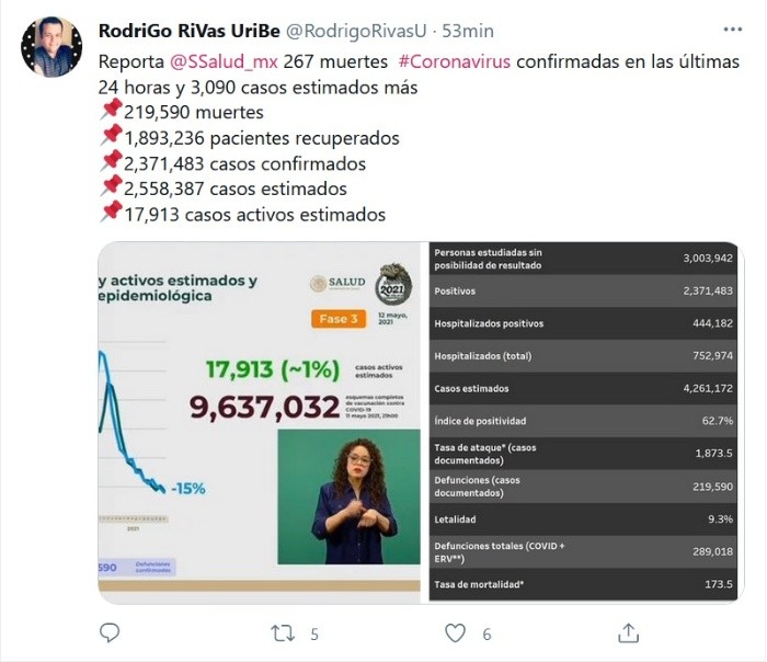 La Secretaría de Salud reportó este miércoles 267 nuevas muertes por COVID-19 en las últimas 24 horas, con lo que llegó a un total de 219 mil 590 decesos, además de tres mil 090 nuevos contagios que elevan a dos millones 371 mil 483 los casos confirmados.