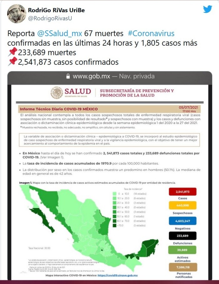 México reportó 67 nuevas muertes por COVID-19, en las últimas 24 horas, para un total 233 mil 689 fallecimientos, informó este lunes la Secretaría de Salud, que también indicó que el país llegó a 47,3 millones de vacunas aplicadas contra el coronavirus.Además, el informe técnico diario registró mil 805 nuevos contagios, que elevan a dos millones 541 mil 873 los casos confirmados.Con estas cifras, México se mantiene como el cuarto país del mundo con más muertes por covid-19, detrás de Estados Unidos, Brasil y la India, y es decimoquinto en número de contagios confirmados, según el recuento de la Universidad Johns Hopkins.El reporte de este lunes indicó que, desde el comienzo de la emergencia, México ha estudiado a 7.58 millones de pacientes.Además, las autoridades sanitarias estiman que el número real de contagios es de dos millones 728 mil 164. De esta cifra están activas 39 mil 889 personas que han presentado síntomas durante los últimos 14 días y que representan poco más del 1.5 % del total.También se reportó que dos millones 019 mil 048 personas están consideradas recuperadas después de haber padecido la enfermedad.La ocupación media de camas generales en los hospitales mexicanos es del 20 % y del 16 % para camas de terapia intensiva.La ocupación hospitalaria ha disminuido un 84 % respecto al pico máximo alcanzado en enero, cuando se saturaron los hospitales de varias ciudades, entre ellas la capital.El informe indicó también que hasta ahora se han administrado 47 millones 316 mil 228 dosis de la vacuna anticovid, al sumar 118 mil 734 en la jornada del domingo.Además, precisó que 19.86 millones de personas han recibido las dosis necesarias para completar el esquema de vacunación en México, que tiene 126 millones de habitantes.JM