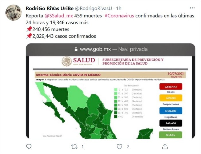 La Secretaría de Salud de México reportó este viernes 19 mil 346 nuevos casos de COVID-19, la mayor cifra diaria desde el 23 de enero pasado cuando las autoridades registraron 20 mil 057 contagios.Además, informó de un récord por segundo día seguido de casos activos en el país, con 131 mil 644, con lo que rebasó los 122 mil 986 también reportados el 23 de enero.México acumula un total de dos millones 829 mil 443 casos confirmados, según el comunicado técnico diario de las autoridades sanitarias, que también añadió 459 nuevas muertes para un acumulado de 240 mil 456 decesos.El país sufre una tercera ola de contagios que acumula dos semanas registrando más de 15 mil casos nuevos, algo no visto desde el pico de la segunda ola en enero pasado.También señalaron que un total de dos millones 204 mil 109 personas se han recuperado del coronavirus.La ocupación media de camas generales en los hospitales mexicanos es del 46 % y del 38 % para camas de terapia intensiva.Con respecto a las defunciones, Ciudad de México -el foco de la pandemia- acumula el 19 % de todos los decesos a nivel nacional, es decir, casi una de cada cinco muertes.El informe indicó también que hasta ahora se han administrado 65.63 millones de dosis de la vacuna anticovid, al sumar 1.12 millones en la jornada del jueves, tercera jornada consecutiva con más de 1.1 millones aplicadas.También precisó que 25.51 millones de personas han recibido las dosis necesarias para completar el esquema de vacunación en México, que tiene 126 millones de habitantes.Este viernes, México recibió 3.6 millones de dosis de la vacuna de AstraZeneca.Si te interesó esta noticia y quieres saber más, entonces descarga y descubre INFORMAPlus, la aplicación digital de EL INFORMADOR, en donde tenemos contenidos exclusivos, seleccionados por nuestros editores, para darles una experiencia más completa a los lectores.Descarga la aplicación y pruébala GRATIS por treinta días.Para iOS: https://apple.co/35jaVgbPara Android: https://bit.ly/3gwVSEVJM