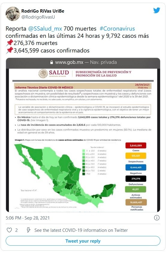 En su informe técnico diario, la Secretaría de Salud informó que, al corte de este martes 28 de septiembre, México ascendió a 276 mil 376 muertes por COVID-19; es decir, el país registró 700 muertes por coronavirus más que el lunes.