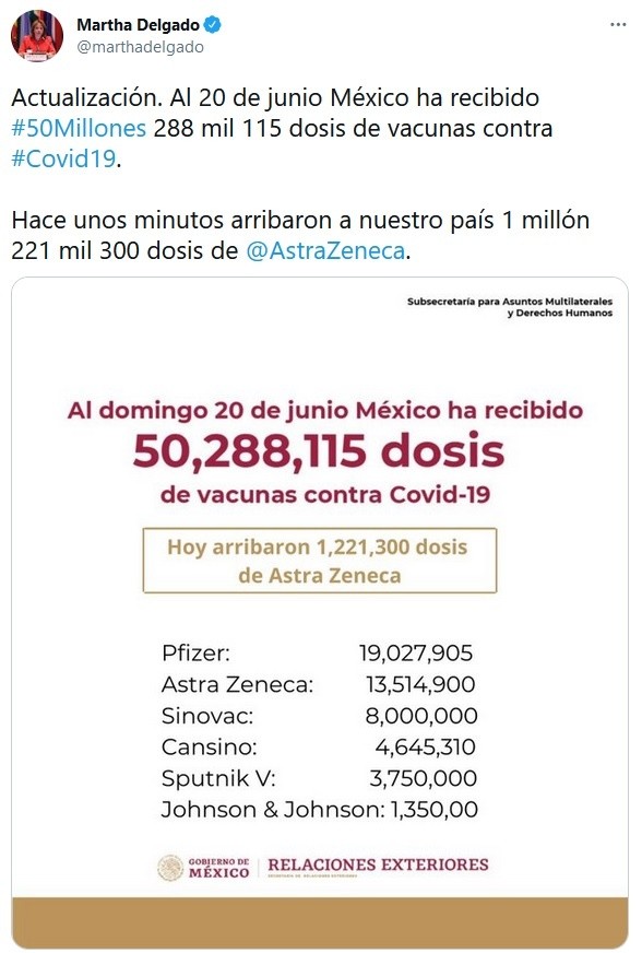 La noche de este domingo arribaron al Aeropuerto Internacional de la Ciudad de México (AICM) un millón 221 mil 300 dosis de la vacuna contra COVID-19 de la farmacéutica AstraZeneca. Con ello, el país rebasa las 50 millones de inmunizaciones recibidas.Por ello, Israel Acosta, coordinador del laboratorio recibió en nombre de su director, Pedro Zenteno, el vuelo 91 con el embarque 77 de vacunas COVID de la marca AstraZeneca. Con lo que se sumarán a las 50 millones 288 mil 115 biológicos de seis farmacéuticas.La Secretaría de Salud Federal (Ssa) mencionó en su reporte del día de ayer, que al corte de las 21:00 horas del sábado 19 de junio, 27 millones 753 mil 807 personas mayores de 18 años han recibido al menos una dosis de la vacuna contra el virus SARS-CoV-2.En ese contexto, dijo que 16 millones 526 mil 469, que representan 60 por ciento, cuentan con esquema completo de vacunación, mientras que once millones 227 mil 338 personas, que son el 40 por ciento del total, cuentan con medio esquema.En el marco del Día del padre, la Secretaría de Salud Federal (Ssa), informó que hasta este 20 de junio, en México se confirmaron 231 mil 187 muertes por COVID-19, es decir, 36 más que ayer.Del mismo modo, el informe técnico diario de la Ssa, reportó dos millones 477 mil 283 casos positivos totales por SARS-CoV-2 en el país, lo que indica que en las últimas 24 horas, México acumuló mil 578 casos de contagio de COVID-19.Mientras que los casos negativos ascienden a cuatro millones 420 mil 396 casos y hay registro de 435 mil 100 casos sospechosos.OA