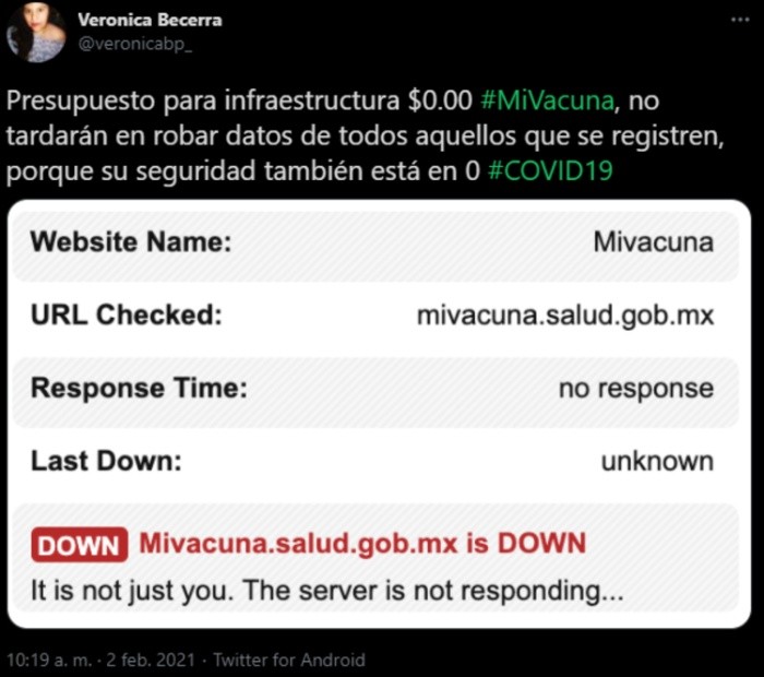 Los usuarios presentan complicaciones para registrar a los adultos mayores en el portal mivacuna.salud.gob.mx.Durante la conferencia matutina de este martes se dio a conocer el inicio del registro para que los adultos mayores de 60 años de edad puedan registrarse para obtener la vacuna contra el COVID-19.Tras el anuncio, los usuarios reportan que no pueden acceder al portal para el registro o que al momento de realizar el llenado de datos no es posible continuar con la comprobación del envío de información.Tampoco es posible ingresar a la guía con información sobre el proceso de registro ni al aviso de privacidad que detalla el uso que se dará a los datos personales de las personas que llenen el formulario.Las personas mayores de 60 años interesadas en vacunarse deben ingresar su CURP en el sitio, posteriormente, el sistema confirma que se trate de la persona la cual debe confirmar sus datos como nombre, entidad federativa, localidad, código postal, compartir un teléfono y un correo electrónico así como notas adicionales.OF