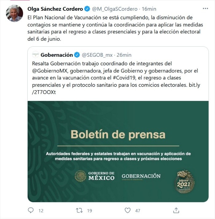 Al destacar que México experimenta un progreso significativo en el combate a la pandemia de COVID-19, la secretaria de Gobernación, Olga Sánchez Cordero, afirmó que ya se puede ver la luz al final del túnel, por lo que advirtió que "las actividades educativas se perfilan como las más urgentes para restablecer".En reunión virtual con los gobernadores y la jefa de Gobierno Claudia Sheinbaum, la funcionaria los exhortó a garantizar las condiciones óptimas para el regreso a clases presenciales. "Reactivar miles de escuelas no es una cosa fácil, por eso solicito su apoyo, de la gobernadora, de la jefa de Gobierno y de los gobernadores aquí reunidos para que generemos las condiciones necesarias para que nuestras niñas, niños, adolescentes y, subrayo, que así lo decidan, puedan regresar a clases".Olga Sánchez dijo que los servidores públicos "debemos y tenemos la obligación de mostrarles a nuestras niñas y niños que ya está cerca la luz al final del túnel, que han sido muchos los sacrificios de todas y de todos, que han permanecido en casa, en condiciones difíciles, pero que ya esto está dando frutos y que la nueva normalidad está a la vuelta del retorno a clases en sus escuelas".En su mensaje inicial en el encuentro virtual con los mandatarios estatales, la secretaria de Gobernación hizo un llamado a apostarle a que el regreso a clases programado en las siguientes semanas "nos funcione y nos funcione bien, sé que es y será un gran esfuerzo el que les toda realizar a todos ustedes en todas las entidades federativas".Destacó que por ello, la Secretaría de Educación Pública continúa desarrollando esquemas y estrategias para recuperar las clases presenciales, al menos uno o dos días a la semana, siempre atendiendo las recomendaciones de la Secretaría de Salud y al semáforo epidemiológico, "pero sin duda, sin bajar la guardia".La titular de la Segob reconoció a los gobernadores y a Claudia Sheinbaum por demostrar en todo momento que México es más grande que cualquier diferencia ideológica y política. En este marco, los exhortó a "no bajar la guardia ahora, tenemos que continuar hasta que toda la población haya sido vacunada, (pues) nuestras acciones como autoridad tienen un impacto significativo en el accionar de la población; si actuamos bien, hacemos lo que nos corresponde, somos transparentes y asertivos, la ciudadanía actuará guiada por la confianza en sus gobernantes e instituciones", precisó.JM