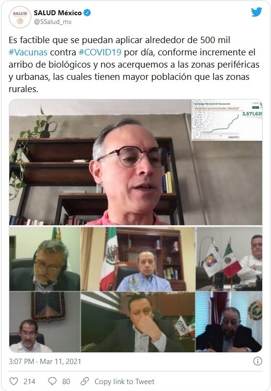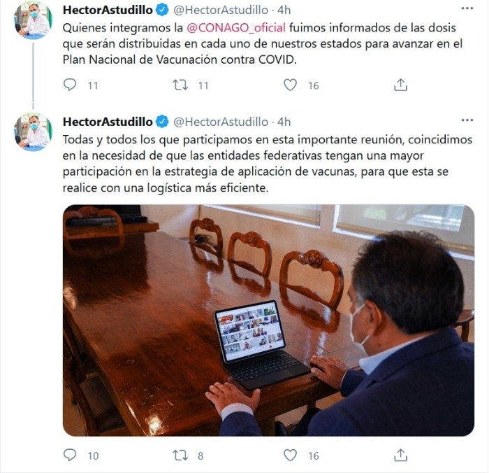 Los integrantes de la Conferencia Nacional de Gobernadores (Conago) pidieron al Gobierno federal tener una mayor participación en el Plan Nacional de Vacunación contra el COVID-19, a fin de que éste tenga una logística más eficiente.Luego de una reunión virtual entre la Conago e integrantes del gabinete federal, el gobernador de Guerrero, Héctor Astudillo, informó en su cuenta de Twitter que todas las personas que participaron en el encuentro coincidieron en que debe haber una mayor participación de los estados en la estrategia de inmunización."Todas y todos los que participamos en esta importante reunión, coincidimos en la necesidad de que las entidades federativas tengan una mayor participación en la estrategia de aplicación de vacunas, para que esta se realice con una logística más eficiente", escribió Héctor Astudillo en sus redes sociales.También el gobernador de Hidalgo, Omar Fayad, señaló que pondrá a disposición del Gobierno federal toda la cooperación posible para evitar contratiempos en la vacunación de adultos mayores, quienes son el primer sector de la población al que se está protegiendo."En el @gobiernohidalgo ponemos a disposición del @GobiernoMX toda la cooperación para que no ocurran conglomeraciones y retrasos en la vacunación, como lo sucedido el pasado lunes", se lee en Twitter.La reunión virtual que se llevó a cabo esta tarde entre la Conago y los integrantes del gabinete estuvo presidida por la titular de la Secretaría de Gobernación (Segob), Olga Sánchez Cordero, así como funcionarios de la Secretaría de Salud (Ssa).Durante el encuentro, el subsecretario de Prevención y Promoción de la Salud, Hugo López-Gatell, consideró posible que en México se apliquen diariamente medio millón de vacunas contra el COVID-19, pero eso depende de la cantidad de dosis que se tengan y si éstas se van a aplicar en zonas urbanas."Es factible que se puedan aplicar alrededor de 500 mil #Vacunas contra #COVID19 por día, conforme incremente el arribo de biológicos y nos acerquemos a las zonas periféricas y urbanas, las cuales tienen mayor población que las zonas rurales", expresó López-Gatell, según información difundida por la Secretaría de Salud en su cuenta de Twitter.JM