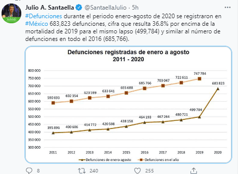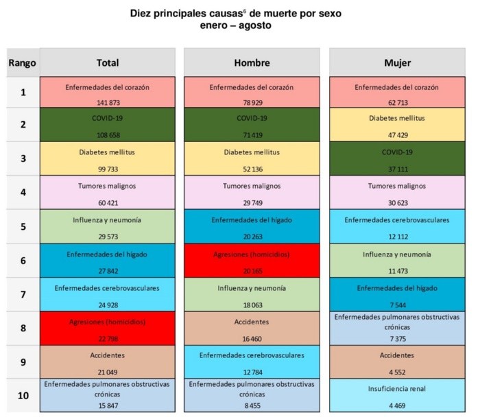 El Instituto Nacional de Estadística y Geografía (Inegi) informó que entre enero y agosto de 2020 se registraron 683 mil 823 defunciones, cifra 36.8% superior a las 467 mil 264 reportadas en el mismo periodo del año anterior, producto principalmente de la pandemia por COVID-19. En el periodo de enero a agosto de 2020, las defunciones por coronavirus ocupan la segunda causa de muerte en México con 108 mil 658 casos, por debajo de las enfermedades del corazón que ocupan el primer lugar con 141 mil 873 y por encima de la diabetes mellitus que ocupa el tercer lugar con 99 mil 733.El número de defunciones por COVID-19 durante los primeros siete meses del año por fue 69% superior a las 64 mil 158 muertes reportadas inicialmente por las autoridades el 30 de agosto de 2020.Es en julio donde se presenta el mayor número de defunciones registradas con un 17.1%, seguido de junio y agosto con un 15.5% y 14.9% respectivamente.Estos resultados se contabilizaron, mediante los registros administrativos generados a partir de los certificados de defunción suministrados por las oficialías del Registro Civil, los Servicios Médicos Forenses y de los cuadernos estadísticos suministrados por las Agencias del Ministerio Público.Las entidades federativas que presentan el mayor número de muertes respecto al año anterior son Estado de México con 84 mil 185, Ciudad de México con 82 mil 449, Veracruz con 50 mil 842 y Jalisco con 40 mil 158.Para el periodo de enero a agosto el 58.7% (401 766) de las defunciones corresponden a hombres, mientras que 41.1% (280 873) a mujeres; en mil 184 casos no se especificó el sexo.En el periodo de 2012 a 2019, se esperaban para enero a agosto 2020 un total de 488 343 defunciones y ocurrieron 673 260, por lo que con base en estos resultados se tiene un exceso de mortalidad por todas las causas de 184 mil 917, equivalente al 37.9%.Las cifras definitivas serán resultado del proceso de confronta entre la Secretaría de Salud y el Inegi y serán publicadas en el mes de octubre de 2021.NR