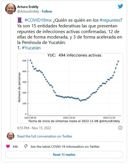 De acuerdo con los reportes semanales de la Secretaría de Salud (Ssa), en una semana han aumentado los casos de COVID en 138 por ciento, ya que en la semana del 4 de noviembre registraron dos mil 310 contagios a diferencia de los cinco mil 504 reportados en esta última semana.De igual forma, los fallecidos han aumentado en una semana, ya que en el penúltimo reporte de la Ssa se registraron 13 muertes, a diferencia de esta última semana que se registraron 38 fallecidos por la enfermedad.La última semana que se registró un cifra similar fue el 11 de octubre del 2022, ya que la Ssa informó que en ese periodo se dieron seis mil 471 contagios y 70 muertos por COVID-19.Este martes Arturo Erdély, estadista de la Universidad Nacional Autónoma de México (UNAM) informó en su cuenta oficial de Twitter que existe un repunte de casos COVID-19 a nivel nacional."Se confirma el repunte de la epidemia a nivel nacional porque el número efectivo de reproducción (Rt = 1.34) es ya claramente superior a 1.0 y con tendencia ascendente", escribió.De acuerdo con las autoridades de salud, las subvariantes BQ.1 y BQ.1.1 tienen mayor transmisibilidad respecto a cepas anteriores hasta en un 30 por ciento.JM