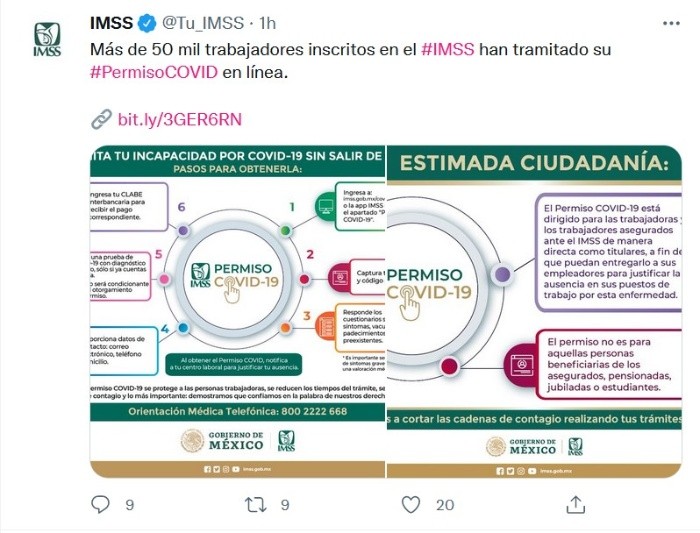 Desde el 10 de enero a la fecha, el Instituto Mexicano del Seguro Social (IMSS) ha otorgado 50 mil 967 autorizaciones del Permiso COVID a través de la aplicación IMSS Digital o en línea, dirigido a trabajadores asegurados ante la institución de manera directa como titulares, a fin de que puedan entregarlo a sus empleadores para justificar la ausencia en sus puestos de trabajo.El instituto a cargo de Zoe Robledo recordó que esta solicitud es únicamente para personas inscritas en el Régimen Obligatorio y que el tipo de modalidad otorgue las prestaciones en dinero, y no a quienes están inscritos en las modalidades 32 (Seguro Facultativo), 33 (Seguro de Salud para la Familia) y 40 (Continuación Voluntaria al Régimen Obligatorio).Con el Permiso COVID, los trabajadores que presenten contagios por el virus SarsCoV2 obtienen su incapacidad hasta por siete días y el pago correspondiente en su cuenta bancaria, de manera fácil, rápida y sin necesidad de realizar traslados con el fin de romper las cadenas de contagio."El Permiso COVID es una respuesta ante la pandemia, por ello se encuentra disponible y en funcionamiento para las personas trabajadoras con sintomatología de coronavirus, o aquellas personas asintomáticas que cuentan con una prueba de laboratorio con resultado positivo, en donde deberán llenar un cuestionario para obtener su permiso a través de la aplicación IMSS Digital o el sitio web imss.gob.mx/covid-19/permiso", expresó el IMSS.El trabajador deberá agregar su CURP, NSS, código postal y dar clic en “Iniciar” para responder los cuestionarios sobre síntomas, vacunación y padecimientos preexistentes. Posteriormente, el sistema le pedirá ingresar información complementaria: Número telefónico de contacto y si cuenta con prueba de enfermedad respiratoria -aunque ésta no será condicionante para el otorgamiento de Permiso COVID cuando se presentan síntomas.Para finalizar la solicitud, deberá proporcionar un correo electrónico y la cuenta CLABE interbancaria para recibir el pago correspondiente; al obtener el Permiso COVID-19 deberá notificarlo a su patrón con el fin de justificar la ausencia en su centro laboral.Esta estrategia no está sujeta al semáforo epidemiológico y tampoco pide como requisito obligatorio presentar una prueba COVID. La duración de este permiso es de siete días para derechohabientes con síntomas y de cinco días para personas asintomáticas que tienen prueba positiva.JM