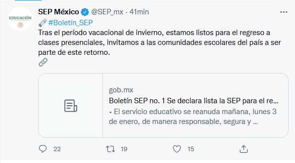 A través de un comunicado, la Secretaría de Educación Pública (SEP) hizo un llamado a acatar las medidas contra el nuevo coronavirus en el regreso a clases presenciales, este lunes, tras el periodo vacacional de invierno.Además, el organismo educativo recordó que, en las primeras semanas de 2022 y en coordinación con las autoridades de Salud, locales y federales, se llevará a cabo la vacunación de refuerzo a los maestros.La dependencia recordó asimismo que, para evitar cualquier contagio de COVID-19, es necesario que las comunidades escolares, entre ellas, personal docente y de apoyo a la educación, alumnos, padres de familia, tutores y autoridades educativas, acaten las recomendaciones contenidas en la Guía para el regreso responsable y ordenado a las escuelas.La SEP apuntó que, como lo establece el calendario escolar vigente para las escuelas públicas y particulares incorporadas al Sistema Educativo Nacional, este 3 de enero se reanudan las clases en las 32 entidades del país.También informó que durante la primera semana de enero se suspenderán las clases únicamente el jueves 6, por lo que, el viernes 7 estudiantes y docentes de educación básica llevarán a cabos sus actividades con normalidad.La SEP también recordó que durante las primeras semanas de 2022 se realizará la vacunación de refuerzo a maestras, maestros, personal administrativo y de apoyo a la educación.La dependencia dijo que es importante la participación de padres de familia y tutores en la aplicación de los protocolos sanitarios, como el uso de cubrebocas y gel antibacterial, además de la revisión periódica de temperatura, al tiempo que les recomendó vigilar que sus hijos no presenten algún síntoma cómo fiebre, tos, catarro o escurrimiento nasal y, en caso contrario, informar a las autoridades escolares.El regreso a clases en el país se dará en medio un repunte en los contagios, cifra que en el último día de 2021 superó los 10 mil casos.JM