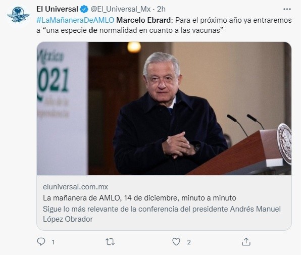 Hace un año, México se convirtió en el primer país en América Latina en tener vacunas contra el COVID-19 y se prevé que antes de que termine este año lleguen más de 200 millones de dosis, por lo que el secretario de Relaciones Exteriores (SRE) Marcelo Ebrad ha calificado la estrategia con la que México ha enfrentado la pandemia cómo exitosa."A un año de que se inició la estrategia que instruyó el Presidente sobre vacunas fuimos el primer país en América Latina en tener vacunas, el 23 de diciembre se cumple un año, vamos a tener cerca de 200 millones este año, que es la meta que se nos había puesto(..)” señaló el secretario Marcelo Ebrad. En la conferencia de prensa matutina del presidente Lopez Obrador, el secretario señaló que más de 80 millones de mexicanos han sido inmunizados contra la pandemia, además añadió que así, México ha ocupado el séptimo lugar en cuestión de países con más vacunas aplicadas a nivel mundial."Tenemos más de 80 millones de personas ya protegidas, 37% de las vacunas han sido envasadas en México y somos el séptimo país con más vacunas aplicadas en números absolutos", concluyó el canciller Marcelo Ebrad.DO