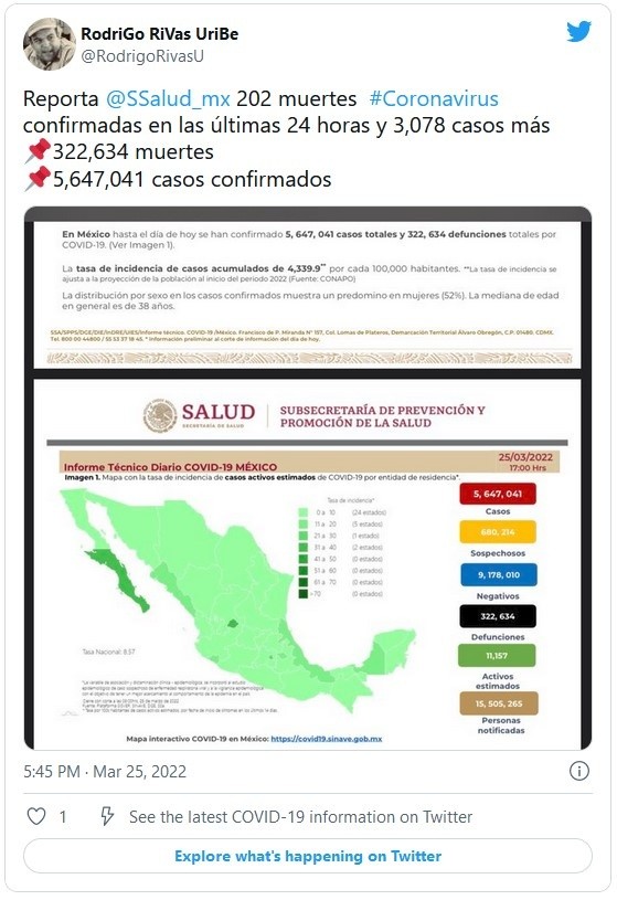México reportó este viernes 202 nuevas muertes y tres mil 078 contagios por COVID-19, con lo que totaliza cinco millones 643 mil 963 casos y acumula 322 mil 634 decesos en total, informó la Secretaría de Salud.Con estos datos, México es el vigésimo país en el mundo en número de contagios confirmados y es el quinto con más decesos por esta causa, por detrás de Estados Unidos, Brasil, India y Rusia, según el recuento de la Universidad Johns Hopkins.De los contagios confirmados, hay 11 mil 157 casos activos, que han presentado síntomas durante los últimos 14 días y suponen el 0.2 % del total; además, desde el inicio de la pandemia se han recuperado cuatro millones 944 mil 194 personas.La ocupación media de camas generales se sitúa en un 6 % y la de terapia intensiva en un 4 %, con tendencia a la baja.Las autoridades también indicaron que dentro del programa de vacunación se han administrado más de 189.8 millones de dosis, al sumar 403 mil 199 durante la última jornada.De los 126 millones de habitantes, 85.55 millones de mexicanos han recibido al menos una dosis de la vacuna, con lo que el 90 % de la población de 18 años y más ha recibido al menos una aplicación. En tanto, 79.62 millones de personas han completado su pauta de vacunación.JM