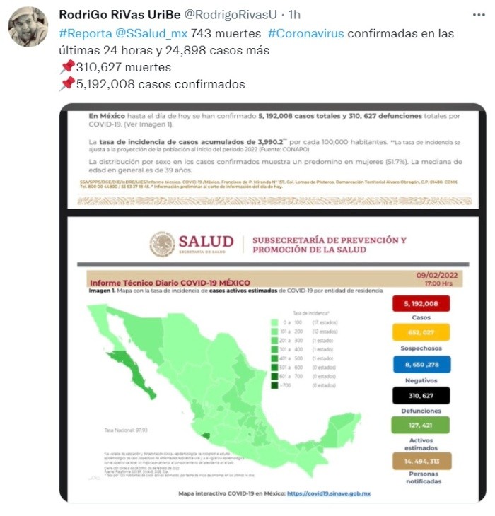 México registró este miércoles 24 mil 898 nuevos contagios de COVID-19 para llegar a un total de cinco millones 192 mil 008 casos, además de 743 muertes para totalizar 310 mil 627 decesos, informó la Secretaría de Salud.Los 743 decesos son la segunda cifra más alta durante la cuarta ola tras las 829 reportadas el 1 de febrero.Con estos datos, México es el decimosexto país en el mundo en número de contagios confirmados y es el quinto con más decesos por esta causa, por detrás de Estados Unidos, Brasil, India y Rusia, según el recuento de la Universidad Johns Hopkins.Las autoridades sanitarias reconocen que, con base en las actas de defunción, el país puede rozar los 460 mil fallecimientos y estiman que México acumula en realidad cinco millones 460 mil 457 contagios.De los contagios confirmados, hay 127 mil 421 casos activos, que han presentado síntomas durante los últimos 14 días y suponen el 2.3% del total.Además, desde el inicio de la pandemia se han recuperado cuatro millones 405 mil 695 personas. La ocupación media de camas generales se sitúa en un 37% y la de terapia intensiva en un 26%.Pese al alza de contagios en la cuarta ola, el Gobierno ha defendido su gestión de la crisis sanitaria además de que no aplicó restricciones adicionales durante el embate de ómicron.Las autoridades también indicaron que dentro del programa de vacunación se han administrado más de 170.2 millones de dosis, al sumar 388 mil 361 durante la última jornada.El Gobierno de México afirma que es el noveno país que más dosis ha aplicado en números absolutos.De los 126 millones de habitantes, 83.94 millones de mexicanos han recibido al menos una dosis de la vacuna, con lo que 89% de la población de 18 años y más han recibido al menos una aplicación.En tanto, 77.66 millones han completado su esquema de vacunación.MF