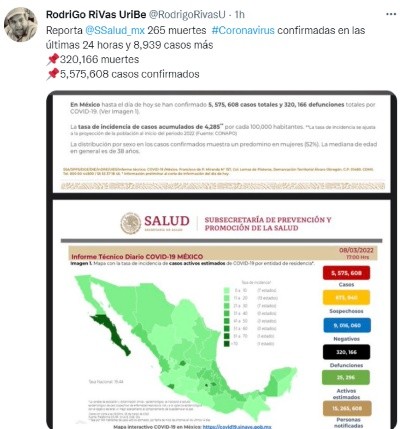 México reportó este martes 265 nuevas muertes y ocho mil 939 contagios por el COVID, con lo que totaliza cinco millones 575 mil 608 casos y acumula 320 mil 166 decesos en total, informó la Secretaría de Salud.Con estos datos, México es el decimosexto país en el mundo en número de contagios confirmados y es el quinto con más decesos por esta causa, por detrás de Estados Unidos, Brasil, India y Rusia, según el recuento de la Universidad Johns Hopkins.El pasado 10 de febrero, el país reportó 927 decesos, la cifra más alta durante la actual cuarta ola, impulsada por la variante ómicron desde diciembre.Las autoridades sanitarias reconocen que, con base en las actas de defunción, el país puede rozar los 460 mil fallecimientos y estiman que México acumula en realidad cinco millones 852 mil 350 contagios.De los contagios confirmados, hay 25 mil 296 casos activos, que han presentado síntomas durante los últimos 14 días y suponen el 0.4% del total.Además, desde el inicio de la pandemia se han recuperado cuatro millones 863 mil 376 personas.La ocupación media de camas generales en hospitales mexicanos se sitúa en un 13% y la de terapia intensiva en un 10% con tendencia a la baja.Respecto a las defunciones, Ciudad de México, el foco de la pandemia, acumula cerca del 17.3% de todos los decesos a nivel nacional.Este martes, el funcionario encargado de gestionar la pandemia en el país, Hugo López-Gatell, afirmó que los contagios de COVID-19 han llegado a "niveles mínimos" en territorio mexicano tras la cuarta ola de infecciones."Hoy por hoy tenemos una tendencia claramente a la reducción y hemos llegado a niveles mínimos de lo que caracterizamos como periodo interepidémico o periodo entre las distintas olas", declaró el subsecretario de Prevención y Promoción de la Salud en la conferencia semanal sobre la pandemia.El pasado 28 de febrero, México cumplió dos años desde el primer caso confirmado de coronavirus, y lo hizo como el quinto país del mundo con más fallecidos, una criticada gestión de la pandemia y un plan de inmunización que avanza a buen ritmo pero sin contemplar a todos los grupos de edad.Las autoridades también indicaron que dentro del programa de vacunación se han administrado más de 183.9 millones de dosis, al sumar 278 mil 282 durante la última jornada.El Gobierno de México afirma que es el noveno país que más dosis ha aplicado en números absolutos. De los 126 millones de habitantes, casi 85.35 millones de mexicanos han recibido al menos una dosis de la vacuna, con lo que el 90% de la población de 18 años y más ha recibido al menos una aplicación.En tanto, 79.15 millones de personas han completado su pauta de vacunación.La semana pasada México recibió 18 millones de dosis de la vacuna británica AstraZeneca en tres distintos envíos, uno de ellos de 14 millones del mecanismo Covax, el más grande que ha recibido en la crisis sanitaria.Desde finales de diciembre de 2020 han llegado a México 220.51 millones de dosis de las vacunas Pfizer, Johnson & Johnson y Moderna, de Estados Unidos; la británica AstraZeneca, la rusa Sputnik V y las chinas CanSino y Sinovac.MF