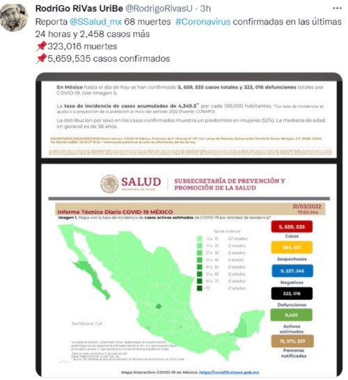 México registró, al corte de este 31 de marzo, 68 fallecidos por COVID-19 lo que sumó 323 mil 016 muertes por la enfermedad.Además hay reporte de dos mil 458 contagios, con los que ya se suman cinco millones 659 mil 535 casos totales de la enfermedad, informó la Secretaría de Salud (Ssa).Señaló que en la distribución de los casos estimados por los grupos de edad seleccionados y semana epidemiológica del 2021, en las últimas cinco semanas, la mayor parte de los casos están presentes en los grupos de 30 a 39 años, seguido del grupo de 18 a 19 años y 40 a 49 años.Detalló que los casos confirmados acumulados por entidad de residencia, las 10 primeras entidades que acumulan el mayor número de casos son: Ciudad de México, Estado de México, Nuevo León, Guanajuato, Jalisco, Tabasco, San Luis Potosí, Veracruz, Puebla y Sonora, que en conjunto conforman el 64% de todos los casos acumulados registrados en el país.MF