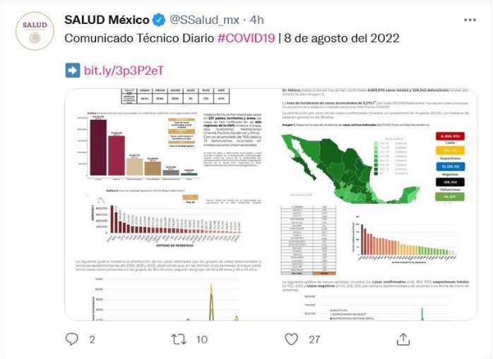 La Secretaría de Salud (Ssa) reportó dos mil 500 contagios de COVID-19 en las últimas 24 horas, lo que sumó seis millones 859 mil 970 casos totales. Además, se reportaron 22 muertes por la enfermedad, lo que acumuló 328 mil 342 fallecidos.Además, detalló que la distribución de los casos estimados por los grupos de edad seleccionados y semanas epidemiológicas del 2020, 2021 y 2022, en las últimas cinco semanas, la mayor parte están presentes en los grupos de 18 a 29 años, seguido del grupo de 30 a 39 años y 40 a 49 años.La dependencia también expuso que las diez primeras entidades que acumulan el mayor número de casos son: Ciudad de México, Estado de México, Nuevo León, Guanajuato, Jalisco, San Luis Potosí, Veracruz, Tabasco, Puebla y Sonora, que en conjunto conforman el 64% de todos los casos acumulados registrados en el país.JM