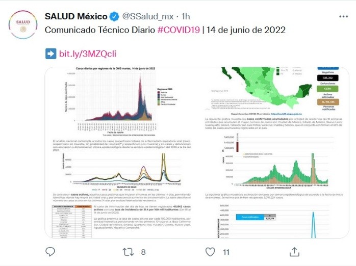 La Secretaría de Salud (Ssa) reportó en las últimas 24 horas ocho mil 206 contagios de COVID-19, lo que sumó cinco millones 833 mil 738 casos totales.También informó que se registraron 37 muertes por la enfermedad, con lo que el país acumuló 325 mil 242 fallecidos desde el inicio de la pandemia.La dependencia detalló que en las últimas cinco semanas, la mayor parte de los casos están presentes en los grupos de 18 a 29 años, seguido del grupo de 30 a 39 años y 40 a 49 años. Además resaltó que la distribución por sexo en las defunciones confirmadas muestra un predominio del 62% en hombres. La mediana de edad en los decesos es de 64 años.La Secretaría expuso que las 10 primeras entidades que acumulan el mayor número de casos son: Ciudad de México, Estado de México, Nuevo León, Guanajuato, Jalisco, Tabasco, San Luis Potosí, Veracruz, Puebla y Sonora, que en conjunto conforman el 65% de todos los casos acumulados registrados en el país.JM