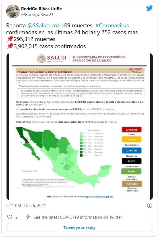 Este lunes, la Secretaría de Salud informó que México registró 110 nuevas muertes por COVID-19 para llegar a 295 mil 312 decesos totales, así como 752 nuevos contagios para un total de tres millones 902 mil 015 infecciones.El país suma más de 17 semanas consecutivas de descenso en los contagios tras una tercera ola que tuvo su pico entre julio y agosto.De la cifra total de casos, hay 17 mil 960 activos, que han presentado síntomas durante los últimos 14 días y suponen el 0.4 % del total; además, desde el inicio de la pandemia se han recuperado tres millones 260 mil 084 personas.La ocupación media de camas generales se sitúa en un 16 % y el uso de camas de terapia intensiva en un 13 por ciento.El subsecretario de Salud, Hugo López-Gatell, hizo un llamado a la calma ante la llegada de ómicron a México, y aseguró que no es una variante "más agresiva".Las autoridades también indicaron que dentro del programa de vacunación se han aplicado más de 134.5 millones de dosis, al sumar 139 mil 217 durante la última jornada.De 126 millones de habitantes, 78.38 millones de adultos tienen al menos una dosis de la vacuna. Es decir, el 86 % del total de la población mayor de edad y de ese total, el 84 % (65.45 millones) han completado su esquema de vacunación.JM