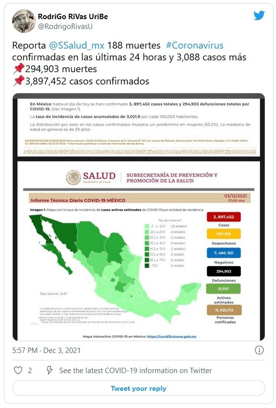 México reportó 188 nuevas muertes por COVID en las últimas 24 horas, para llegar a 294 mil 903 decesos, y tres mil 088 nuevos contagios, para un total de tres millones 897 mil 452, según informó este viernes la Secretaría de Salud.El país suma más de 17 semanas consecutivas de descenso en los contagios tras una tercera ola que alcanzó su pico en julio y agosto.De la cifra de casos confirmados, hay 21 mil 757 activos, que han presentado síntomas durante los últimos 14 días y suponen el 0.5 % del total.La ocupación media de camas generales se sitúa en un 16 % y el uso de camas de terapia intensiva en 13 por ciento.Este viernes, la Secretaría de Salud confirmó el primer caso en el país de la variante ómicron del coronavirus en una persona proveniente de Sudáfrica que ingresó en un hospital con síntomas de COVID.Las autoridades también indicaron que dentro del programa de vacunación, que contempla a todos los mayores de 18 años, se han aplicado más de 133.7 millones de dosis, al sumar 436 mil 098 durante la última jornada.Hasta ahora, 77.74 millones de personas mayores de 18 años tienen al menos una dosis. Es decir, el 85 % del total de la población mayor de edad. De ese total, el 84 % (65.25 millones) ha recibido el esquema completo.JM