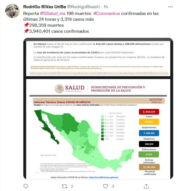 La Secretaría de Salud informó este miércoles que México registró 198 muertes por COVID-19 para llegar a 298 mil 359 decesos totales y tres mil 319 nuevos contagios para un total de tres millones 940 mil 401.Con estas cifras, México se mantiene como el cuarto país con más muertes por el virus, detrás de Estados Unidos, Brasil y la India, y el decimoquinto en número de contagios confirmados, según el recuento de la Universidad Johns Hopkins.De la cifra total de casos, hay 17 mil 931 activos, que han presentado síntomas durante los últimos 14 días y suponen el 0.4 % del total. Además, desde el inicio de la pandemia se han recuperado tres millones 293 mil 911 personas.La ocupación media de camas generales en los hospitales mexicanos se sitúa en un 15 % y el uso de camas de terapia intensiva en un 12 por ciento.Las autoridades también indicaron que dentro del programa de vacunación se han aplicado más de 147.5 millones de dosis, al sumar 392 mil 345 durante la última jornada.De sus 126 millones de habitantes, 81,9 millones en el país tienen al menos una dosis de la vacuna, es decir, el 87 % del total de la población mayor de edad. De ese total, el 88 % (72.4 millones) ha completado su esquema de vacunación.JM