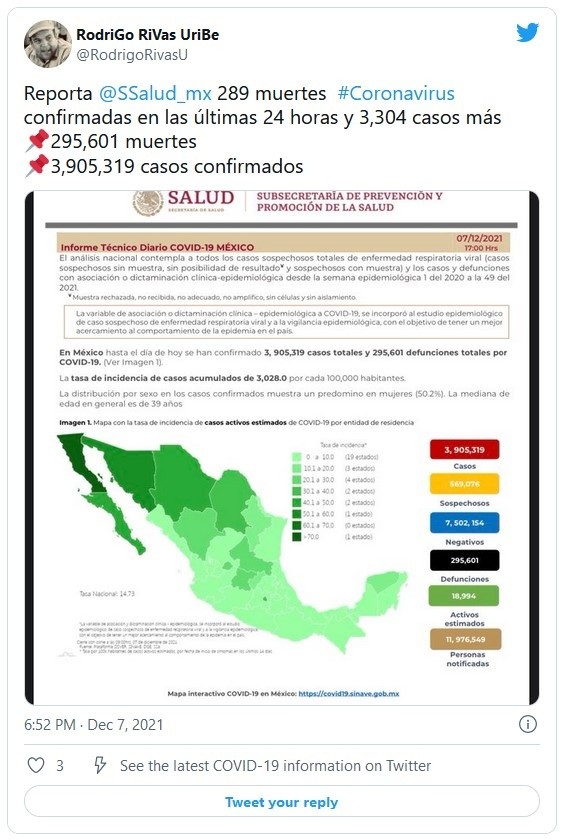 La Secretaría de Salud informó este martes que el país registró 289 nuevas muertes por COVID-19 para llegar a 295 mil 601 decesos totales, así como tres mil 004 nuevos contagios para un total de tres millones 905 mil 319 infecciones acumuladas.De la cifra de casos, hay 18 mil 994 activos, que han presentado síntomas durante los últimos 14 días y suponen el 0.5 % del total. Además, desde el inicio de la pandemia se han recuperado tres millones 262 mil 422 personas.La ocupación media de camas generales se sitúa en un 16 % y el uso de camas de terapia intensiva en un 13 por ciento.Este martes, el país comenzó a vacunar con dosis de refuerzo contra el virus a todos los mayores de 60 años, incluido al Presidente Andrés Manuel López Obrador (AMLO), pero las autoridades no prevén por ahora vacunas de refuerzo para el resto de población.La campaña de dosis de refuerzo llega apenas unos días después de detectarse el primer caso de la variante ómicron del coronavirus en el país.Las autoridades también indicaron que dentro del programa de vacunación se han aplicado más de 134.69 millones de dosis, al sumar 185 mil 058 durante la última jornada.De sus 126 millones de habitantes, 78.53 millones de adultos tienen al menos una dosis de la vacuna; es decir, el 86 % del total de la población mayor de edad. De ese total, el 84 % (65.49 millones) han completado su esquema de vacunación.JM