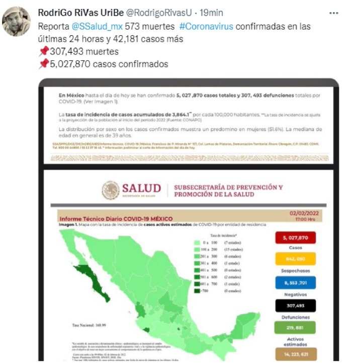 México registró este miércoles 42 mil 181 nuevos contagios de COVID-19 para llegar a un total de cinco millones 027 mil 870 casos, además de 573 muertes para totalizar 307 mil 493 decesos, informó la Secretaría de Salud.El número de muertes reportado este día es el más alto de la cuarta ola de la pandemia en el país. La cifra anterior se registró el 26 de enero con 532.Las autoridades sanitarias reconocen que, con base en las actas de defunción, el país puede rozar los 455 mil fallecimientos y estiman que México acumula en realidad cinco millones 291 mil 119 contagios.De los contagios confirmados, hay 219 mil 881 casos activos, que han presentado síntomas durante los últimos 14 días y suponen el 4.2% del total.Además, desde el inicio de la pandemia se han recuperado cuatro millones 165 mil 270 personas.La ocupación media de camas generales se sitúa en un 45% y la de terapia intensiva en un 30 por ciento.Las autoridades también indicaron que dentro del programa de vacunación se han administrado más de 166.8 millones de dosis, al sumar 666 mil 616 durante la última jornada.De los 126 millones de habitantes, 83.68 millones de mexicanos han recibido al menos una dosis de la vacuna, con lo que 89% de la población de 18 años y más han recibido al menos una dosis.En tanto, 77.3 millones han completado su esquema de vacunación.MF