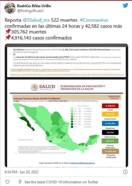 México registró este sábado 42 mil 582 nuevos contagios de COVID para llegar a un total de cuatro millones 916 mil 143 casos, además de 522 muertes para totalizar 305 mil 762 decesos, informó la Secretaría de Salud.El país ha mantenido el promedio de contagios diarios por encima de los 40 mil, aunque la pasada semana, registró sus cifras más altas de casos nuevos, con un récord histórico de 60 mil 552 el 19 de enero, además de muertes diarias por encima de las 300.De los contagios confirmados, hay 296 mil 042 casos activos, que han presentado síntomas durante los últimos 14 días y suponen el 5.7 % del total. Además, desde el inicio de la pandemia se han recuperado tres millones 986 mil 898 personas.La ocupación media de camas generales en hospitales mexicanos se sitúa en un 45 % y la de terapia intensiva en un 29 por ciento.Las autoridades también indicaron que dentro del programa de vacunación se han administrado más de 165.17 millones de dosis, al sumar 601 mil 978 durante la última jornada.De los 126 millones de habitantes, 83.5 millones en el país han recibido al menos una dosis de la vacuna, con lo que 89 % de la población de 18 años y más han recibido al menos una dosis; en tanto, 77 millones han completado su esquema de vacunación.JM