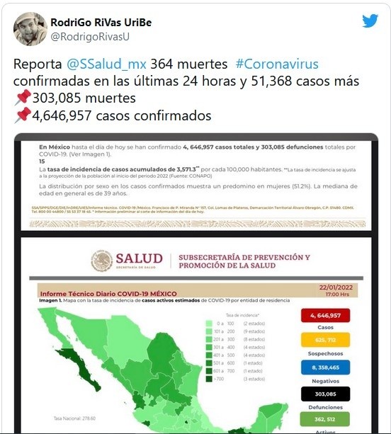 México registró este sábado 51 mil 368 nuevos contagios de COVID-19, la segunda cifra más alta de toda la pandemia, para un total de cuatro millones 646 mil 957 casos, además de 364 muertes para llegar a 303 mil 085 decesos totales, informó la Secretaría de Salud.En la última semana, el país ha reportado sus cifras más altas de contagios, con un récord histórico de 60 mil 552 el miércoles, además de muertes diarias por encima de las 300.Del total de infecciones reportadas, hay 362 mil 512 casos activos, que han presentado síntomas durante los últimos 14 días y suponen el 7.4 % del total.Además, desde el inicio de la pandemia se han recuperado tres millones 662 mil 458 personas.La ocupación media de camas generales se sitúa en un 41 % y la de terapia intensiva en un 24 por ciento.Las autoridades también indicaron que dentro del programa de vacunación se han administrado 159.63 millones de dosis, al sumar 716 mil 751 durante la última jornada.De los 126 millones de habitantes, 83.27 millones en el país han recibido al menos una dosis de la vacuna, con lo que 89 % de la población de 18 años y más han recibido al menos una dosis. En tanto, 76.44 millones han completado su esquema de vacunación.JM