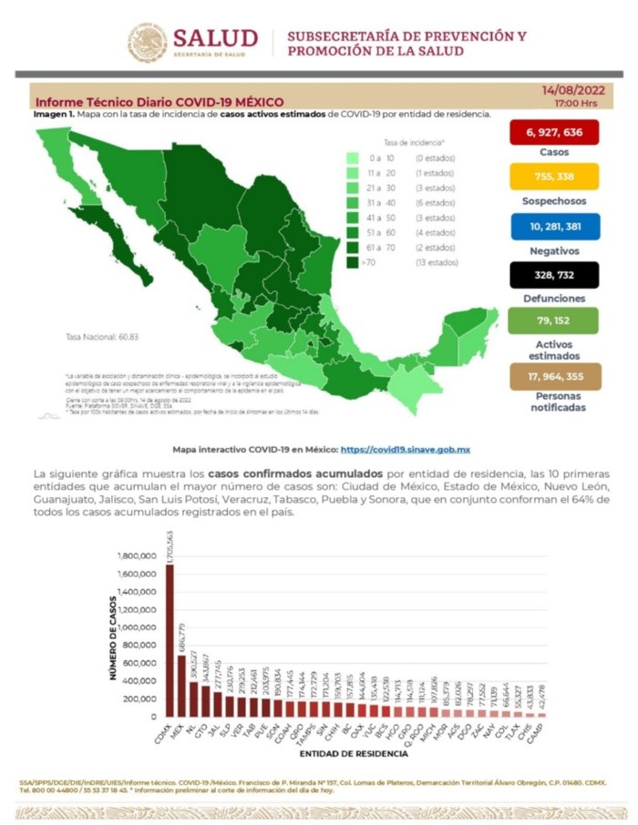 La Secretaría de Salud (Ssa) reportó mil 968 contagios de COVID-19 lo que sumó seis millones 927 mil 636 casos totales. Además, informaron que las últimas 24 hrs, se registraron ocho muertes por la enfermedad lo que acumuló 328 mil 732 fallecimientos.La dependencia resaltó que la distribución por sexo en los casos confirmados muestra un predomino en mujeres (53.1%). La mediana de edad en general es de 38 años.Además, expuso los casos confirmados acumulados por entidad de residencia, por lo que las diez primeras entidades que suman el mayor número de casos son: Ciudad de México, Estado de México, Nuevo León, Guanajuato, Jalisco, San Luis Potosí, Veracruz, Tabasco, Puebla y Sonora, que en conjunto conforman el 64% de todos los casos acumulados registrados en el país.MF