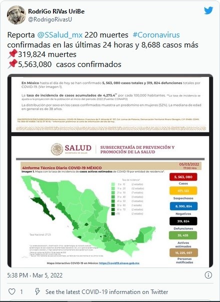 México reportó este sábado 220 nuevas muertes y ocho mil 688 contagios de COVID, con lo que totaliza cinco millones 563 mil 080 casos y acumula 319 mil 824 decesos en total, informó la Secretaría de Salud.Con estos datos, México es el decimosexto país en el mundo en número de contagios confirmados y es el quinto con más decesos por esta causa, por detrás de Estados Unidos, Brasil, India y Rusia, según el recuento de la Universidad Johns Hopkins.De los contagios confirmados, hay 35 mil 435 casos activos, que han presentado síntomas durante los últimos 14 días y suponen el 0.6 % del total.Además, desde el inicio de la pandemia se han recuperado cuatro millones 842 mil 078 personas.La ocupación media de camas generales en hospitales mexicanos se sitúa en un 14 % y la de terapia intensiva en un 11 % con tendencia a la baja.Este viernes, la Secretaría de Salud informó que a partir del lunes 7 de marzo y hasta el domingo 20, que los 32 estados del país ninguno estará en semáforo de riesgo epidemiológico rojo (máximo riesgo de contagios), ni en naranja (riesgo alto), y sólo habrá uno en amarillo (riesgo medio) y 31 en verde (riesgo bajo), entre ellos la Ciudad de México.Las autoridades también indicaron que dentro del programa de vacunación se han administrado más de 183.29 millones de dosis, al sumar 249 mil 621 durante la última jornada.De los 126 millones de habitantes, casi 85.33 millones de mexicanos han recibido al menos una dosis de la vacuna, con lo que el 90 % de la población de 18 años y más ha recibido al menos una aplicación.En tanto, 79.07 millones de personas han completado su pauta de vacunación.JM