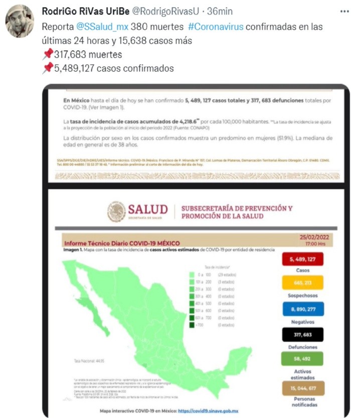 México registró este viernes 380 nuevas muertes y 15 mil 638 contagios por el COVID-19, con lo que totaliza cinco millones 489 mil 127 casos y acumula 317 mil 683 decesos en total, informó la Secretaría de Salud.Las autoridades sanitarias reconocen que, con base en las actas de defunción, el país puede rozar los 460 mil fallecimientos y estiman que México acumula en realidad cinco millones 763 mil 299 contagios.De los contagios confirmados, hay 58 mil 492 casos activos, que han presentado síntomas durante los últimos 14 días y suponen cerca del 1% del total.La ocupación media de camas generales en hospitales mexicanos se sitúa en un 20% y la de terapia intensiva en un 14% con tendencia a la baja.A partir del pasado lunes la mitad de los 32 estados del país pasó a semáforo verde por bajo riesgo epidémico, mientras que los otros 16 se encuentran en amarillo, por riesgo medio.El encargado de la pandemia en el país, Hugo López-Gatell, afirmó este martes que la pandemia por COVID-19 en México suma ya cuatro semanas con “reducciones de la intensidad epidémica” y avances “muy sustanciales” en la cobertura de vacunación.Las autoridades también indicaron que dentro del programa de vacunación se han administrado más de 180.7 millones de dosis, al sumar 638 mil 089 durante la última jornada.De los 126 millones de habitantes, poco más de 85 millones de mexicanos han recibido al menos una dosis de la vacuna, con lo que 90% de la población de 18 años y más ha recibido al menos una aplicación.En tanto, 78.8 millones han completado su pauta de vacunación.MF