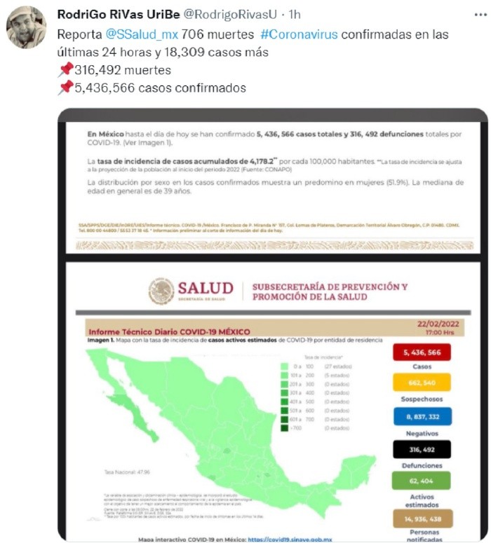 México registró este martes 706 nuevos fallecimientos y 18 mil 309 contagios por el COVID, con lo que totaliza cinco millones 436 mil 566 casos y acumula 316 mil 492 decesos en total, informó la Secretaría de Salud.Con estos datos, México es el decimosexto país en el mundo en número de contagios confirmados y es el quinto con más decesos por esta causa, por detrás de Estados Unidos, Brasil, India y Rusia, según el recuento de la Universidad Johns Hopkins.El 10 de febrero el país reportó 927 decesos, la cifra más alta durante la actual cuarta ola, impulsada por la variante ómicron desde diciembre.Las autoridades sanitarias reconocen que, con base en las actas de defunción, el país puede rozar los 460 mil fallecimientos y estiman que México acumula en realidad cinco millones 710 mil 174 contagios.De los contagios confirmados, hay 62 mil 404 casos activos, que han presentado síntomas durante los últimos 14 días y suponen cerca del 1.1% del total.La ocupación media de camas generales se sitúa en un 23% y la de terapia intensiva en un 16% con tendencia a la baja.Las autoridades también indicaron que dentro del programa de vacunación se han administrado más de 178.64 millones de dosis, al sumar 510 mil 649 durante la última jornada.De los 126 millones de habitantes, poco más de 85 millones de mexicanos han recibido al menos una dosis de la vacuna, con lo que 90% de la población de 18 años y más ha recibido al menos una aplicación.En tanto, 78.7 millones han completado su pauta de vacunación.MF