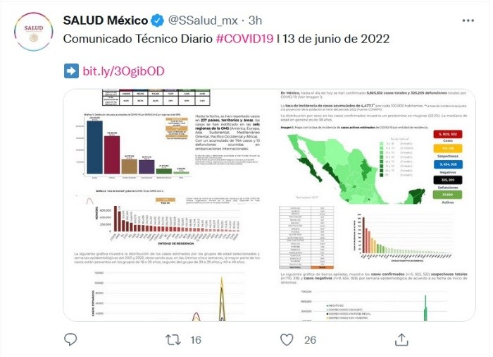 La Secretaría de Salud (Ssa) reportó las últimas 24 horas mil 688 contagios de COVID-19, con lo que México sumó cinco millones 825 mil 532 casos totales del virus.Además, informó que se registraron 11 fallecidos por la enfermedad, lo que acumuló 325 mil 205 muertes en el país.La dependencia detalló que la distribución por sexo en las defunciones confirmadas muestra un predomino del 62% en hombres. La mediana de edad en los decesos es de 64 años.Expuso también, que los casos confirmados acumulados por entidad de residencia, las 10 primeras entidades que acumulan el mayor número de casos son: Ciudad de México, Estado de México, Nuevo León, Guanajuato, Jalisco, Tabasco, San Luis Potosí, Veracruz, Puebla y Sonora, que en conjunto conforman el 65% de todos los casos acumulados registrados en el país.JM