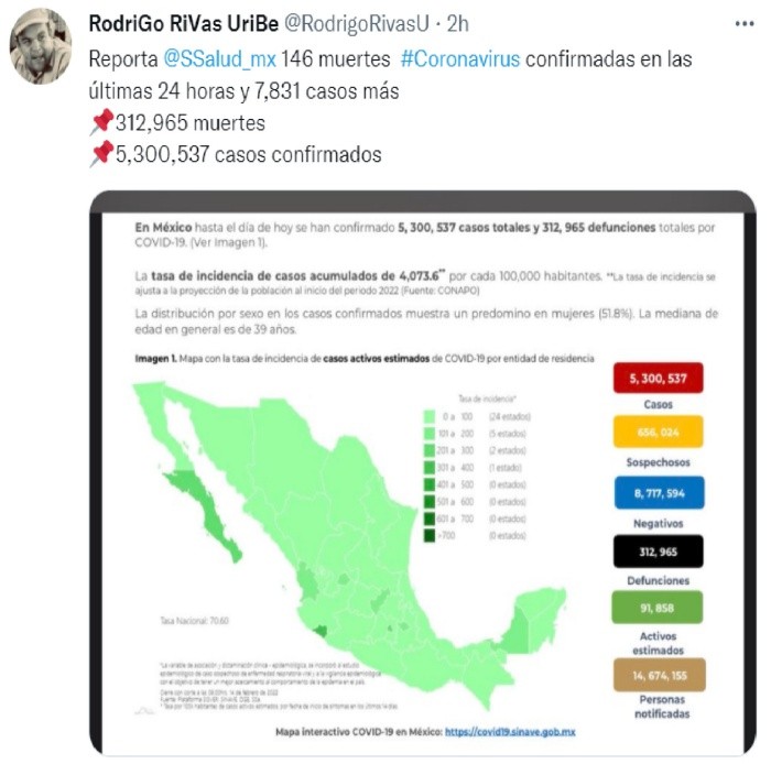 México registró este lunes siete mil 831 nuevos contagios de COVID-19, para un total de cinco millones 300 mil 706 casos, y un acumulado de 312 mil 965 decesos al sumar este día 146 muertes, informó la Secretaría de Salud.Apenas el pasado jueves se registraron 927 decesos, la cifra más alta durante la cuarta ola tras las 829 reportadas el 1 de febrero.Las cifras del semana en México suelen ser más bajas debido al rezago del recuento.Con estos datos, México es el decimosexto país en el mundo en número de contagios confirmados y el quinto con más decesos por esta causa, por detrás de Estados Unidos, Brasil, India y Rusia, según el recuento de la Universidad Johns Hopkins.Las autoridades sanitarias reconocen que, con base en las actas de defunción, el país puede rozar los 460 mil fallecimientos y estiman que México acumula en realidad cinco millones 571 mil100 contagios.De los contagios confirmados, hay 91 mil 858 casos activos, que han presentado síntomas durante los últimos 14 días y suponen el 1.6% del total.Además, desde el inicio de la pandemia se han recuperado cuatro millones 540 mil 48 personas.La ocupación media de camas generales se sitúa en un 30% y la de terapia intensiva en un 22%.Pese al alza de contagios en la cuarta ola, el Gobierno ha defendido su gestión de la crisis sanitaria y no aplicó restricciones adicionales durante el embate de la variante ómicron.Las autoridades también indicaron que dentro del programa de vacunación se han administrado más de 172.67 millones de dosis, al sumar 192 mil 851 durante la última jornada.De los 126 millones de habitantes, 84.11 millones de mexicanos han recibido al menos una dosis de la vacuna, con lo que 89% de la población de 18 años y más han recibido al menos una aplicación.En tanto, 77.95 millones han completado su esquema de vacunación.Desde finales de diciembre de 2020 han llegado a México 202.46 millones de dosis de las vacunas Pfizer, Johnson & Johnson y Moderna, de Estados Unidos; la británica AstraZeneca, la rusa Sputnik V y las chinas CanSino y Sinovac. MF