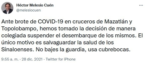 Al menos 400 pasajeros de un crucero con un brote de COVID-19 desembarcaron hoy en Guaymas, Sonora, informó el secretario de Salud estatal, José Luis Alomía Zegarra.El desembarco se da luego de que autoridades de Jalisco y Sinaloa han negado el descenso de turistas de cruceros donde se han detectado contagios del coronavirus.Alomía informó que en el crucero MS Zuiderdam, con mil 219 pasajeros y 772 tripulantes, les reportaron que hay 30 personas con COVID-19, de las cuales 28 son miembros de la tripulación y 2 pasajeros, los cuales están en aislamiento en el barco."Las personas que no fueron identificadas ni como casos ni como contactos entonces pueden, sin ningún problema, descender del buque", explicó Alomía en rueda de prensa junto al gobernador Alfonso Durazo, de Morena.Agregó que se estableció un filtro sanitario con gel antibacterial, toma de temperatura y revisión de uso de cubrebocas. La Secretaría de Turismo federal informó este martes que recibirá a los cruceros que soliciten atracar en sus puertos marítimos."Con respecto a un crucero al que se le negó acceso en dos puertos marítimos de nuestro país, se informa que será recibido en el puerto de Guaymas, Sonora, con el apoyo del gobierno de esa entidad".La Secretaría de Salud Jalisco (SSJ) informó ayer que en el caso de un crucero que llegó a Puerto Vallarta el 27 de diciembre, en el cual se confirmó un total de 69 contagios de COVID, por lo que la dependencia solicitó pruebas de antígenos negativas a los pasajeros que desearan desembarcar."La empresa optó por no tomar esta disposición y decidió que no descendieran pasajeros, por lo que el crucero permanecerá en el puerto las horas que tenía previstas", dijo la SSJ en un comunicado.Indicó que el crucero salió el 24 de diciembre de Long Beach (California, en Estados Unidos) con la ruta Jalisco (Puerto Vallarta), Sinaloa (Mazatlán) y Baja California Sur (Los Cabos).Según el calendario de cruceros de la Administración Portuaria Integral Puerto Vallarta, ayer arribó el Carnival Panorama.El 23 de diciembre, la autoridad sanitaria no autorizó el desembarco en Puerto Vallarta de pasajeros de un crucero con un brote activo de COVID-19, con 21 casos entre miembros de la tripulación. La SSJ dijo que se pidieron pruebas anti COVID negativas para desembarcar, pero la empresa optó por seguir su trayecto.Ese crucero zarpó el 19 de diciembre de San Diego (California, en Estados Unidos), con 874 tripulantes y mil 035 pasajeros, y había visitado Cabo San Lucas y Mazatlán.La Secretaría de Salud de Sinaloa informó hoy que no permitió el descenso de personas de dos cruceros, uno en Mazatlán y otro que llegará mañana a Topolobampo, tras detectarse brotes de coronavirus."Ante brote de COVID-19 en cruceros de Mazatlán y Topolobampo, hemos tomado la decisión de manera colegiada suspender el desembarque de los mismos. El único motivo es salvaguardar la salud de los Sinaloenses. No bajes la guardia, usa cubrebocas", escribió en su cuenta de Twitter el secretario de Salud estatal, Héctor Melesio Cuén.IM