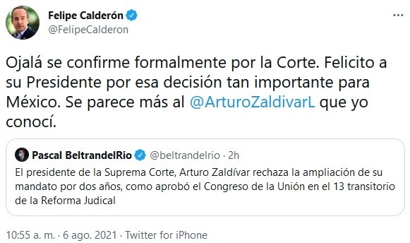 Luego de que Arturo Zaldívar anunció que rechazaba la ampliación de mandato como ministro presidente de la Suprema Corte de Justicia de la Nación (SCJN), el expresidente Felipe Calderón lo felicitó.A través de redes sociales, Calderón felicitó a Zaldívar "por esa decisión tan importante para México" y pidió que ojalá se confirme formalmente por la SCJN."Se parece más al Arturo Zaldívar que yo conocí", escribió el exmandatario tras conocer la decisión del ministro presidente de la Corte, que terminará su mandato el 31 de diciembre de 2022.Este viernes, el ministro presidente de la SCJN rechazó ampliar su periodo al frente del máximo tribunal en México."Yo no estoy aquí por cargos", dijo Zaldívar, quien explicó que su único compromiso es con la Constitución y con los Derechos Humanos."Ese es mi único compromiso, de tal suerte que quiero informar que concluiré mi mandato como presidente de la Corte el 31 de diciembre de 2022, cuando termina el periodo para el cual fui electo por mis compañeros", refirió.Durante el mensaje a medios que ofreció, Zaldívar agradeció la confianza y el apoyo que el Presidente Andrés Manuel López Obrador (AMLO) le expresó respecto a la ampliación de mandato en la Corte."Mi decisión ya está tomada, con independencia de lo que resuelva la Corte", dice el ministro presidente a pregunta de la prensa.Si quieres tener más contenido, más imágenes y aún más noticias, entonces descarga INFORMAPlus, la aplicación digital de EL INFORMADOR, donde tenemos materiales exclusivos para tí.Descarga la aplicación y pruébala GRATIS por treinta días. Para iOS: https://apple.co/35jaVgbPara Android: https://bit.ly/3gwVSEVSi eres suscriptor de EL INFORMADOR tu acceso está incluido, solicítalo al 33 3678-7777OA