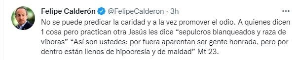 El exmandatario, Felipe Calderón, através de sus redes sociales, respondió al llamado de seguir el ejemplo de Jesús del presidente Andrés Manuel López Obrador en su mensaje navideño.Luego de que el presidente recordara que librepensadores y practicantes de otras religiones reconocen a Jesús por su amor a los pobres y por los olvidados, Calderón Hinojosa expresó que "no se puede predicar la caridad y a la vez promover el odio".En su cuenta oficial de Twitter, el ex mandatario citó uno de los versículos de la Biblia, San Mateo 23:28. "Así son ustedes: por fuera aparentan ser gente honrada, pero por dentro están llenos de hipocresía y de maldad".Quien también hizo un llamado al perdón fue la doctora Beatriz Gutiérrez Müller, quien en su mensaje de Nochebuena y Navidad deseó lo mejor para los mexicanos.A través de Facebook, la esposa del presidente Andrés Manuel López Obrador agradeció a sus 900 mil seguidores y a quienes interactúan con ella con sus comentarios y propuestas, "con alientos y sugerencias siempre útiles"."A los que vienen a molestar, simplemente (y ya lo saben) no les hacemos caso y los bloqueamos en casos extremos", refirió."Así que gracias a todos. Este día y siempre les deseo lo mejor acompañados de las personas que más quieren y recordando la importancia de ser felices, perdonar y mirar hacia delante para ayudar a todo el que se ha quedado atrás", escribió Gutiérrez Müller.JL