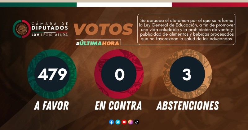 La tarde de este martes, la Cámara de Diputados aprobó con 494 votos a favor la prohibición de vender comida chatarra a menores de edad en escuelas públicas y privadas de educación básica (primarias y secundarias).En lo aprobado se reforma el artículo 50 de la Ley General de los Derechos de Niñas, Niños y Adolescentes para señalar que los niños tienen derecho a disfrutar del más alto nivel posible de salud, por lo que se debe combatir la desnutrición crónica y aguda, sobrepeso y obesidad, así como otros trastornos de conducta alimentaria.Por lo anterior, se prohíbe la venta y distribución gratuita de alimentos envasados con alto contenido calórico.“Combatir la desnutrición (…) debiendo prohibir por cualquier medio la distribución gratuita, venta y suministro de bebidas azucaradas y alimentos envasados de alto contenido calórico a menores de edad en las instituciones educativas públicas y privadas de educación básica, así como la venta a través de distribuidores automáticos o máquinas expendedoras de estos productos al interior de dichas instituciones”, dice el dictamen aprobado. En la iniciativa se menciona que 3 de cada 10 niños viven con sobrepeso, según datos de la Encuesta Nacional de Salud y Nutrición de 2016.
