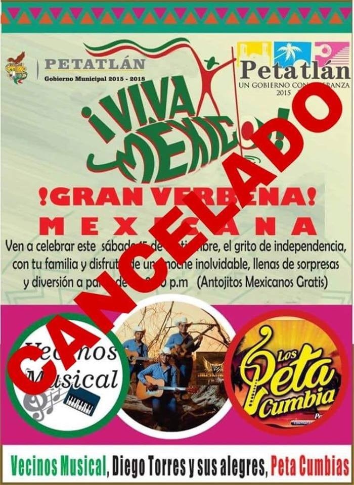 El gobierno de Petatlán publicó en sus redes sociales el aviso de cancelación del grito, así como del desfile cívico-militar; la decisión se tomó después de que la noche del viernes un grupo armado atacara un módulo de la Policía Municipal y dos de los agresores murieran.