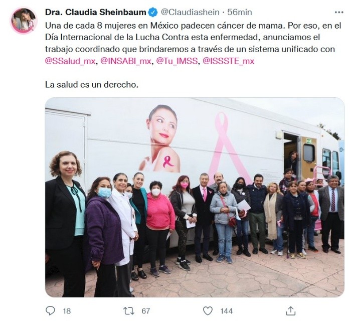En el marco del Día Internacional de la Lucha contra el Cáncer de Mama, la jefa de Gobierno Claudia Sheinbaum informó que se trabaja en un esquema integral de atención del cáncer de mama con todas las instituciones de salud del Gobierno de México: el ISSSTE, IMSS, Insabi y la Secretaría de Salud capitalina, con el objetivo de implementarse en todo el país. El proyecto lleva por nombre "Código cáncer".“Lo que queremos hacer es un esquema de atención de cáncer de mama unificado de todas las instituciones de salud, estamos trabajando en ello (…), que podamos atendernos en la Secretaría de Salud, también en el Instituto del Seguro Social y también en el ISSSTE, aun cuando no tengamos derechohabiencia, igual que como hicimos con el COVID”, explicó.Claudia Sheinbaum señaló que, en el inicio de este trabajo, el esquema de atención integral de cáncer de mama contemplaría la atención primaria de promoción y detección oportuna, atención especializada, estudios, tratamiento y medicamentos, y se estima que pueda ejecutarse en el 2023.“Las mujeres no están solas y tampoco están solas cuando se trata de su salud”, enfatizó Sheinbaum.Agregó que el objetivo es fortalecer todo lo que tiene que ver con atención de cáncer de mama y al mismo tiempo “avanzar a que esto pueda ser universal, que podamos ir a una u otra entidad, independientemente de nuestra derechohabiencia”, comentó.En su intervención, Zoé Robledo, director general del Instituto Mexicano del Seguro Social (IMSS), destacó que el objetivo de unificar y tener un solo sistema de salud es reducir los tiempos entre la detección del cáncer de mama y el inicio del tratamiento, “unir fuerzas, capacidades y experiencia a favor de las mujeres de todo el país”.Explicó que la estrategia requiere construir redes de referencia regionales entre hospitales públicos con servicios oncológicos y avanzar hacia los estándares internacionales de atención, que van de las dos semanas de la sospecha al diagnóstico y 62 días como máximo del diagnóstico al tratamiento.En el evento realizado en la alcaldía Iztacalco de la Ciudad de México también estuvieron presentes el director general del ISSSTE, Pedro Zenteno; la secretaria de Salud capitalina, Oliva López; la directora del Programa de Prevención y Control del Cáncer de la Mujer CNEGSR, Alejandra Armengol; y César Arce, en representación del director general del Insabi.JM
