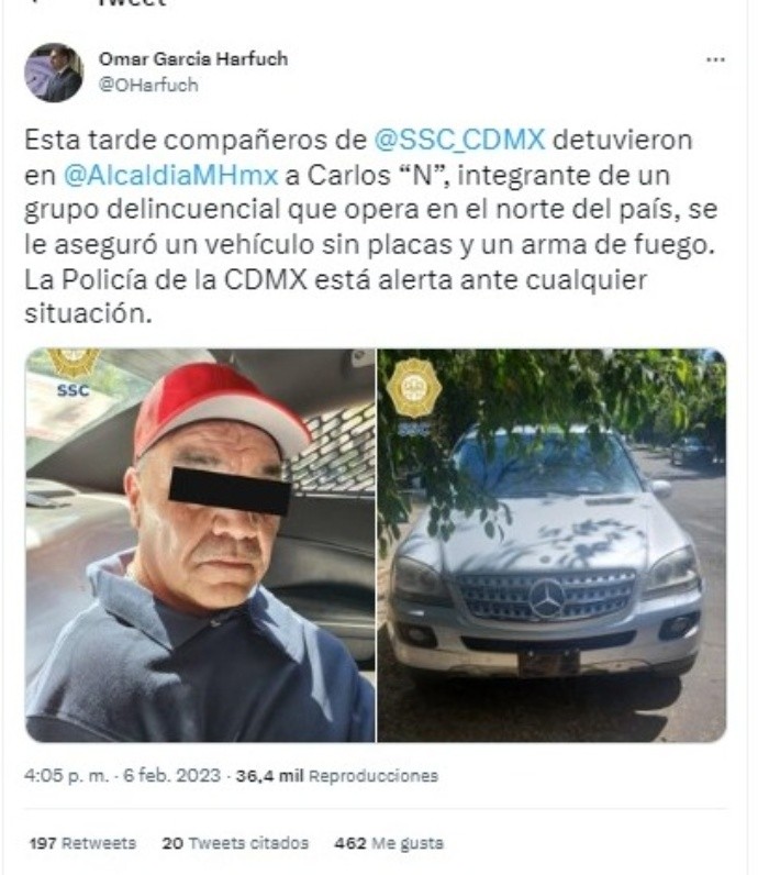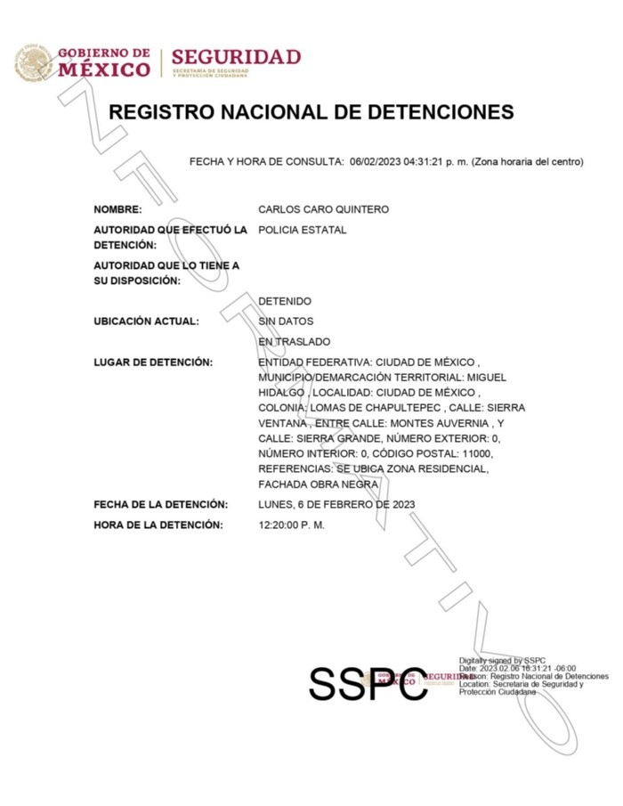 Carlos Caro Quintero, hermano de Rafael Caro Quintero "El Narco de narcos", fue detenido este lunes a las 12:20 en la alcaldía Miguel Hidalgo, Ciudad de México, de acuerdo con el Registro Nacional de Detenciones.Omar García Harfuch, titular de la Secretaría de Seguridad Ciudadana (SSC), reveló en redes sociales que el hombre pertenece a un grupo delincuencial que opera al norte de la Ciudad de México. El funcionario resaltó que le fue asegurado un vehículo sin placas y un arma de fuego. Carlos Caro Quintero se encuentra en la Fiscalía Especializada de Delitos Contra la Salud de la fiscalía de la Ciudad de México, en espera de que se determine su situación jurídica. Rafael Caro Quintero, fundador del cártel de Guadalajara, ordenó secuestrar al agente de la Administración de Control de Drogas estadounidense (DEA, por sus siglas en inglés) Enrique Camarena Salazar, así como al piloto mexicano Alfredo Zavala Avelar. Ambos fueron asesinados.Era el hombre más buscado por la DEA y ofrecían 20 millones de dólares por información para capturarlo.Caro Quintero fue recapturado por la Secretaría de Marina (Semar) en julio del año pasado luego de estar prófugo nueve años.Estaba prófugo después de haber sido dejado en libertad en 2013, cuando había cumplido 28 de los 40 años de sentencia.
