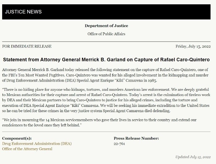 El fiscal General de Estados Unidos, Merrick Brian Garland, dijo por medio de un comunicado que su país buscará la extradición inmediata de Rafael Caro Quintero.Este viernes se dio a conocer la detención del narco en Choix, Sinaloa. El funcionario estadounidense felicitó a las autoridades mexicanas por la captura del fundador del Cártel de Guadalajara.Dijo que esta detención es la“culminación del trabajo incansable de la DEA y sus socios” en nuestro país.“No hay escondite para nadie que secuestre, torture y asesine a las fuerzas del orden estadounidenses”, aseveró el fiscal.Por otra parte, Merrick Brian Garland lamentó la muerte de 14 integrantes de la Secretaría de la Marina (Semar) tras la caída de un helicóptero en Los Mochis, Sinaloa.El "Narco de Narcos" era uno de los objetivos prioritarios para la DEA, por eso ofrecía una recompensa de 20 millones de dólares por información que llevara a su localización y detención. GA